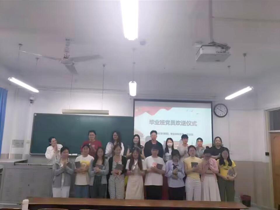 毕业生党员代表发言,表达了对组织培养的感谢和继续发挥党员先锋模范作用的决心。随后,为毕业班党员分发礼物,赠党支部寄语。欢送会上,全体党员起立用掌声为即将离校的党员们送上诚挚的祝愿。